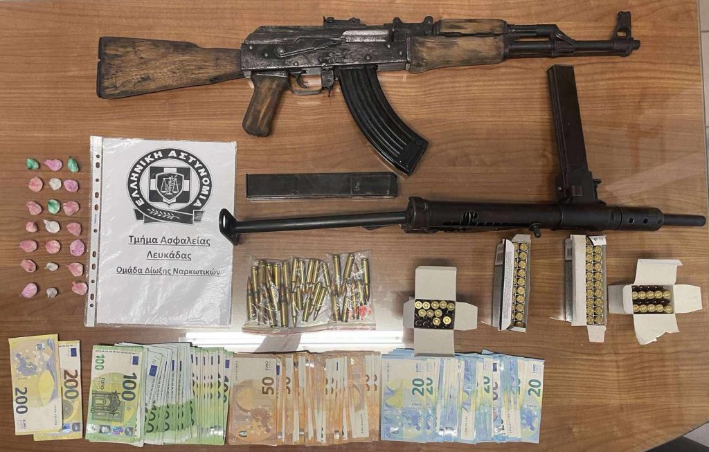 Αναλυτικότερα, μετά από στοχευμένη έρευνα και αξιοποίηση πληροφοριών, στην κατοχή του 49χρονου ημεδαπού βρέθηκαν και κατασχέθηκαν ένα πολεμικό τυφέκιο KALASNIKOV με γεμιστήρα, 21 συσκευασίες με κοκαΐνη, συνολικού βάρους 19 γραμμαρίων, ένα υποπολυβόλο STEN με 2 γεμιστήρες, το χρηματικό ποσό των 7.940 ευρώ και 107 φυσίγγια διαφόρων διαμετρημάτων.