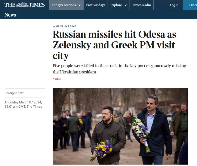 «Ρωσικοί πύραυλοι έπληξαν την Οδησσό την ώρα που ο Ζελένσκι και ο Έλληνας πρωθυπουργός επισκέπτονταν την πόλη», γράφουν οι Τimes του Λονδίνου.