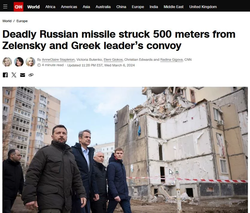 «Ο Ζελένσκι πραγματοποιεί συχνά ταξίδια υψηλού κινδύνου στις γραμμές του μετώπου κι έχει υποδεχθεί δεκάδες ηγέτες στην Ουκρανία στα πάνω από δύο χρόνια του πολέμου με τη Ρωσία, αλλά η επίθεση της Τετάρτης ίσως ήταν μια από τις πιο δραματικές για τον πρόεδρο. Η εγγύτητα του πλήγματος στον Μητσοτάκη – ηγέτη κράτους μέλους του ΝΑΤΟ – υπογραμμίζει επίσης τους κινδύνους τέτοιων επισκέψεων και τους πιθανούς παγκόσμιους αντίκτυπους της σύρραξης», ανέφερε το αμερικανικό δίκτυο.
