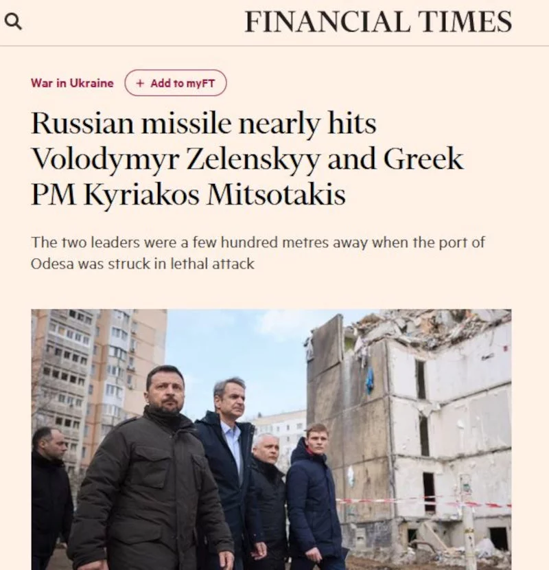 «Ρωσικός πύραυλος παραλίγο να χτυπήσει τον Βολοντίμιρ Ζελένσκι και τον Ελληνα πρωθυπουργό Κυριάκο Μητσοτάκη», σημείωσαν οι Financial Times.