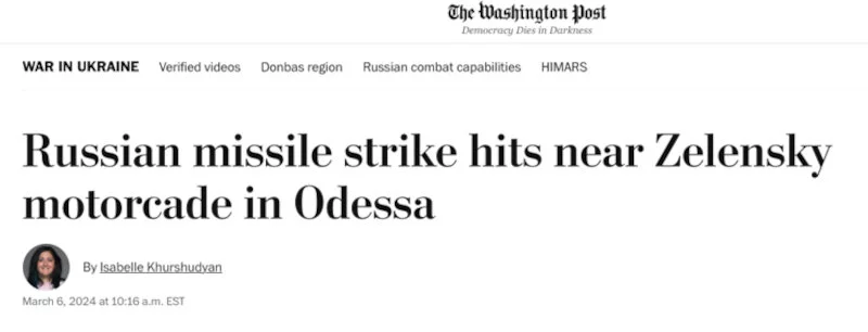 «Ρωσικός πύραυλος χτυπά κοντά στην αυτοκινητοπομπή του Ζελένσκι στην Οδησσό», μετέδωσε η Washington Post.