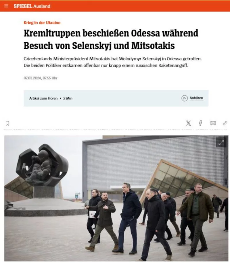 «Πόλεμος στην Ουκρανία: Στρατιώτες του Πούτιν χτυπούν την Οδησσό στη διάρκεια επίσκεψης του Ζελένσκι και του Μητσοτάκη», μετέδωσε το γερμανικό περιοδικό Der Spiegel σημειώνοντας ότι οι δύο ηγέτες «γλίτωσαν παρά τρίχα από τη ρωσική πυραυλική επίθεση».