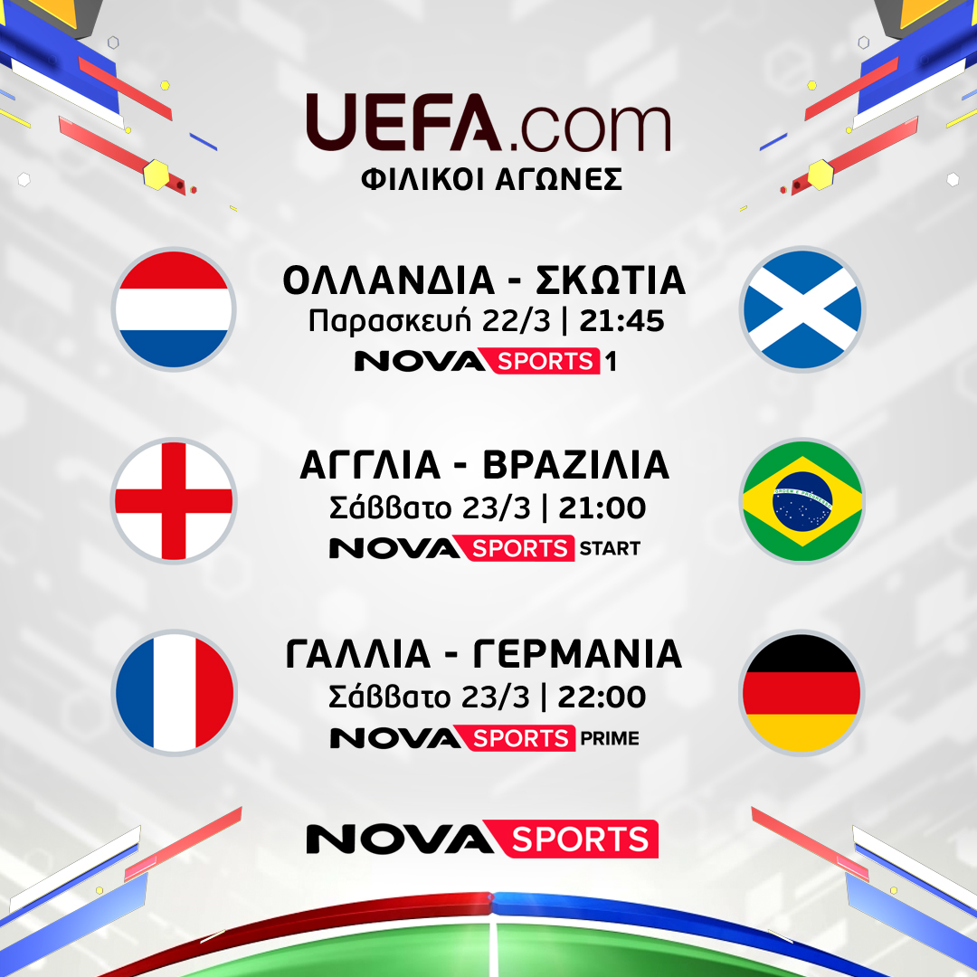 Την ίδια χρονική περίοδο διεξάγονται και σημαντικά φιλικά παιχνίδια με τους συνδρομητές του Novasports να απολαμβάνουν κορυφαίες εθνικές ομάδες Κύπρος-Λετονία (21/3, 19:00), Πορτογαλία-Σουηδία (21/3, 21:45), Ολλανδία-Σκωτία (22/3, 21:45), Αγγλία-Βραζιλία (23/3, 21:00), Γαλλία-Γερμανία (23/3, 22:00), Κύπρος-Σερβία (25/3, 19:00), Γερμανία-Ολλανδία (26/3, 21:45), Αγγλία – Βέλγιο (26/3, 22:00), Γαλλία-Χιλή (26/3, 22:00), Ισπανία-Βραζιλία (26/3, 22:30).