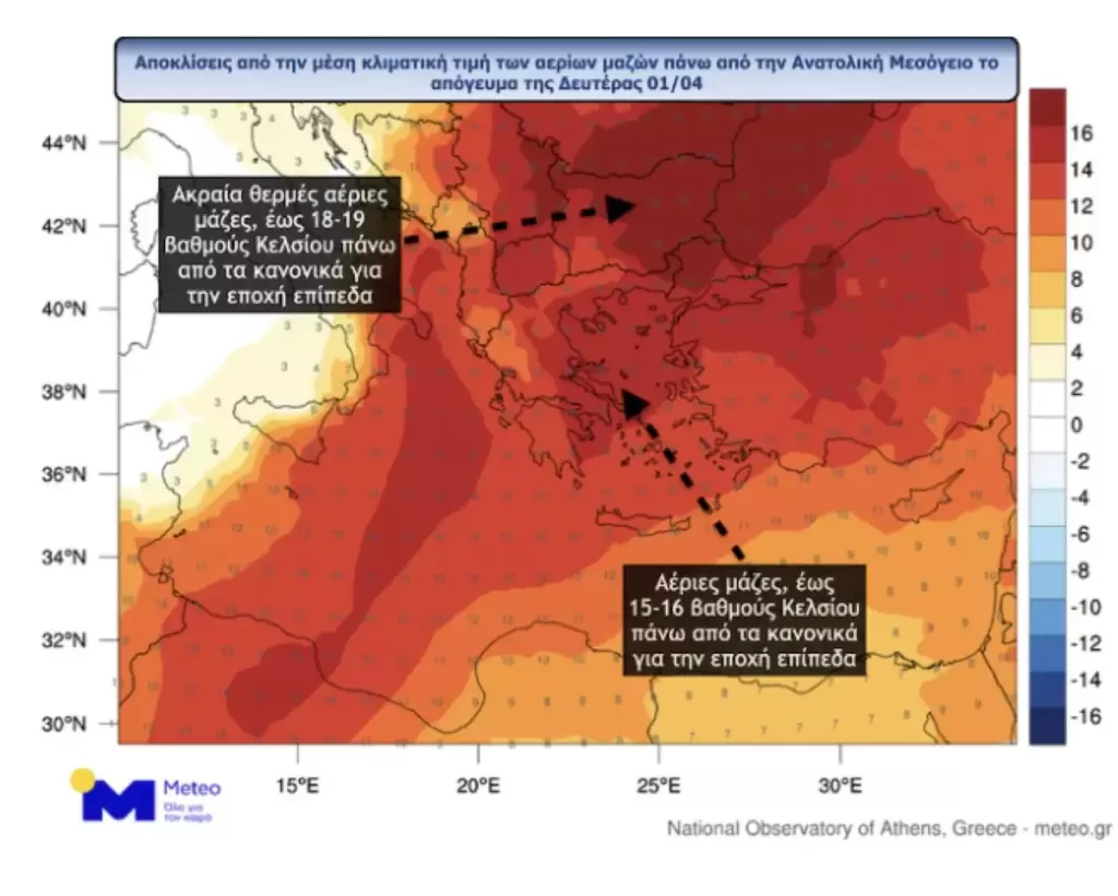 Σύμφωνα με το meteo.gr, η ατμοσφαιρική κυκλοφορία πάνω από την Ευρώπη τις επόμενες ημέρες θα ευνοήσει την μεταφορά ακραία θερμών για την εποχή αερίων μαζών από την Αφρική προς την Ανατολική Ευρώπη και την χώρα μας με την κορύφωση να αναμένεται το τριήμερο Κυριακή (31.03.24) – Τρίτη (02.04.24).