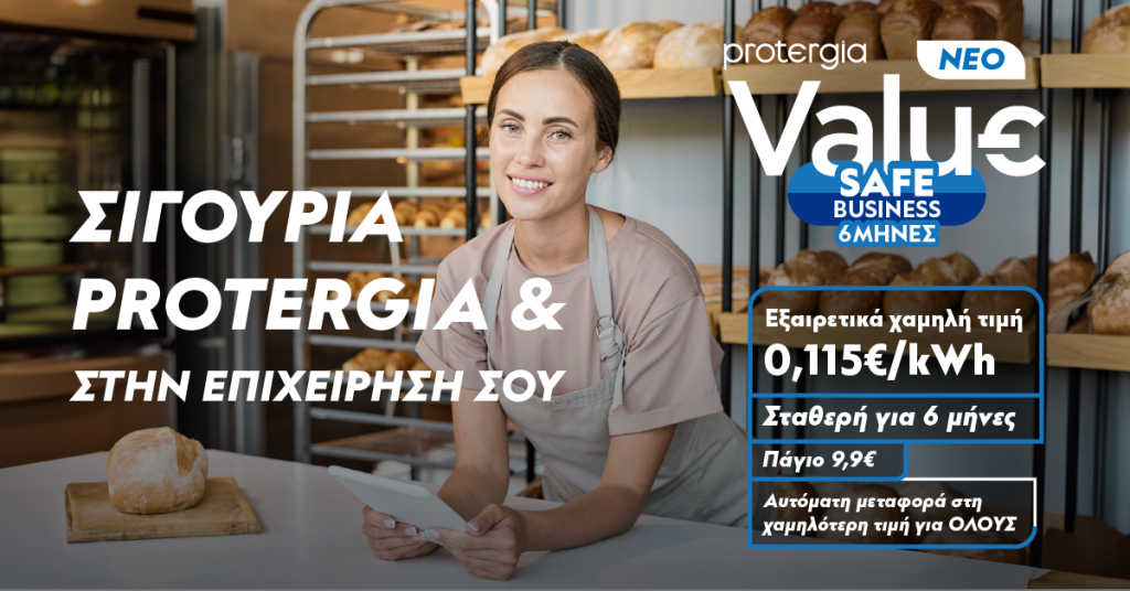 Η Protergia καλεί τους επαγγελματίες να επισκεφθούν την ιστοσελίδα της για να ενημερωθούν για το νέο σταθερό 6μηνο πρόγραμμα για επαγγελματίες Protergia Value Safe Business.