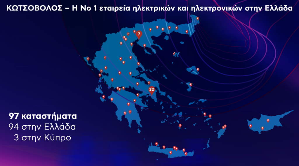 - Κωτσόβολος: Κορυφαίο και ολοκληρωμένο δίκτυο ηλεκτρικών και ηλεκτρονικών προϊόντων, με 97 φυσικά καταστήματα σε Ελλάδα και Κύπρο, εκ των οποίων 27 megastores και πολυκαναλικό (omnichannel) δίκτυο πωλήσεων