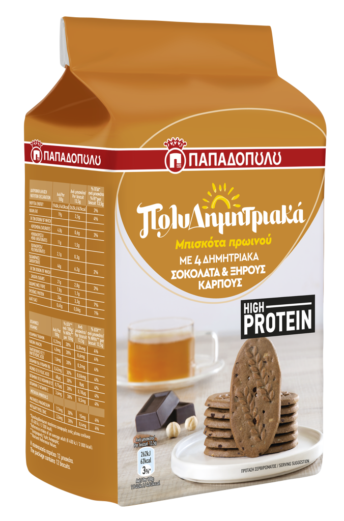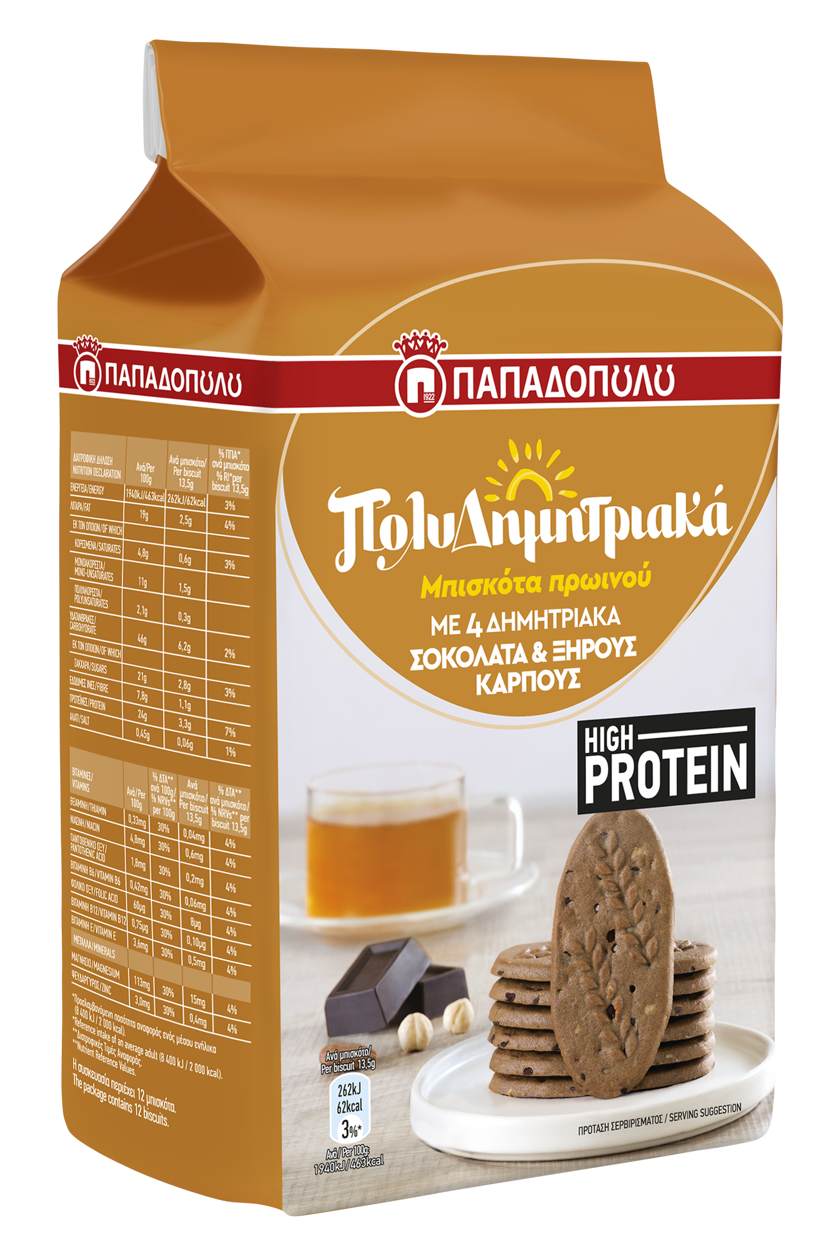 Τα νέα ΠολυΔημητριακά μπισκότα πρωινού High Protein, ξεχωρίζουν για την μοναδική γεύση σοκολάτας και ξηρών καρπών αλλά κυρίως για την υψηλή περιεκτικότητά τους σε πρωτεΐνη, που τα καθιστούν ιδανική επιλογή για όσους ζουν σε έντονους ρυθμούς, αλλά παράλληλα αναζητούν θρεπτικές λύσεις. Παράλληλα απευθύνεται σε όσους θέλουν να αυξήσουν την κατανάλωση πρωτεΐνης στην διατροφή τους, και να βοηθήσουν την αύξηση της μυϊκής μάζας του σώματος τους και την διατήρηση της καλής κατάστασης των οστών, στα πλαίσια μιας ποικίλης, ισορροπημένης διατροφής και άσκησης.