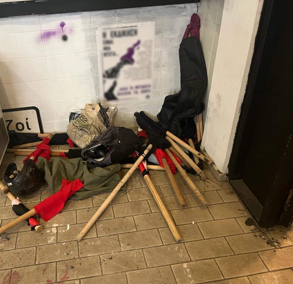 Οι αστυνομικοί εντόπισαν κράνη, αντιασφυξιογόνες μάσκες και στυλιάρια.
