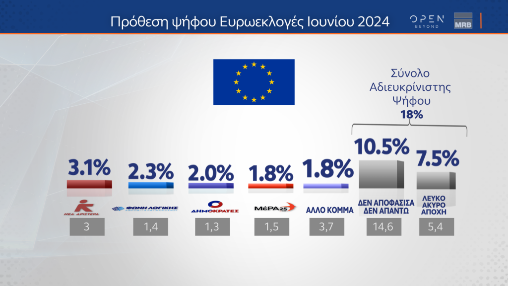 Στην πρόθεση ψήφου για τις ευρωεκλογές 2024 τα ποσοστά διαμορφώνονται ως εξής:
