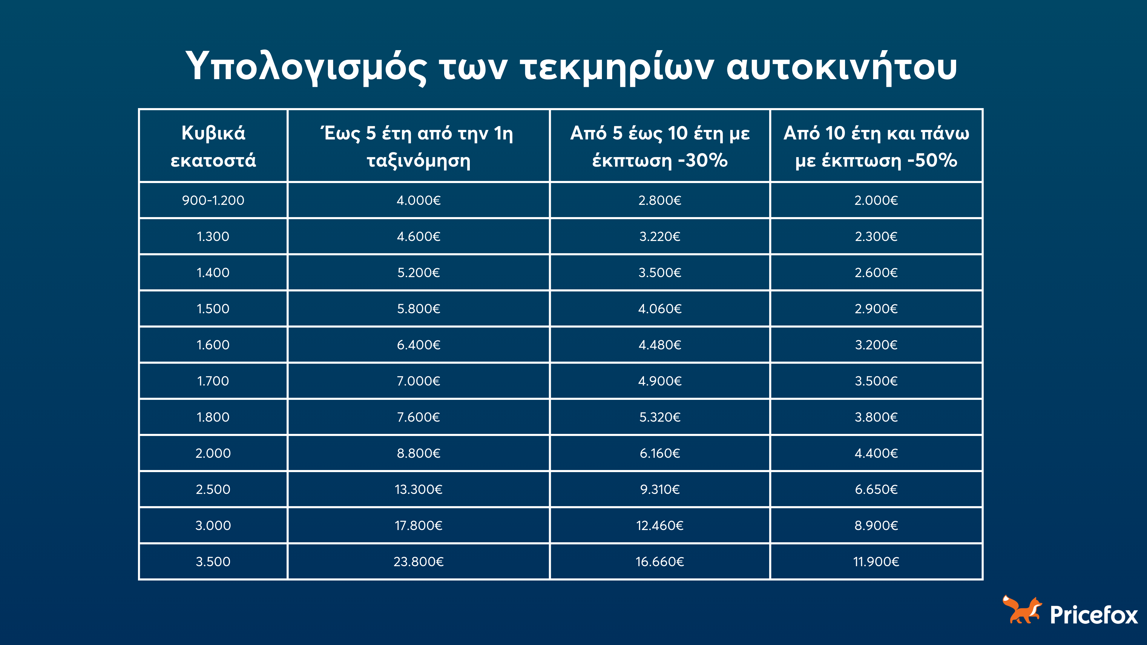 - 2.000 έως 3.000 κυβικά: 900€ ανά 100 κυβικά.