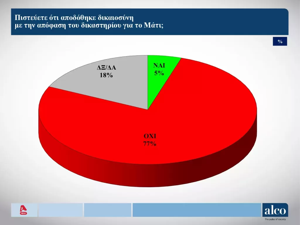 Οσοι συμμετείχαν στην έρευνα ρωτήθηκαν αν αποδόθηκε δικαιοσύνη με την απόφαση του δικαστηρίου για την τραγωδία στο Μάτι με το 77% να απαντά «όχι».