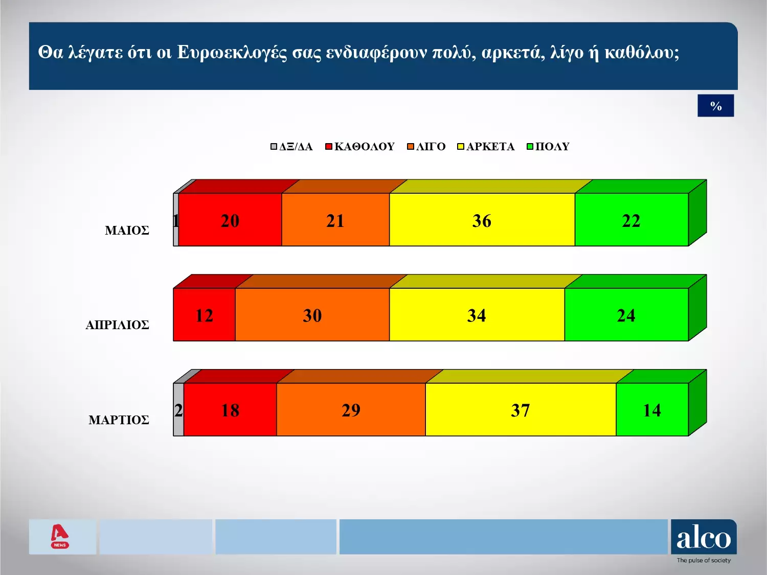 Στην ερώτηση πόσο ενδιαφέρουν οι ευρωεκλογές τους πολίτες, το 22% απαντά «πολύ» το 36% απαντά «αρκετά», το 21% «λίγο» και το 20% «καθόλου».