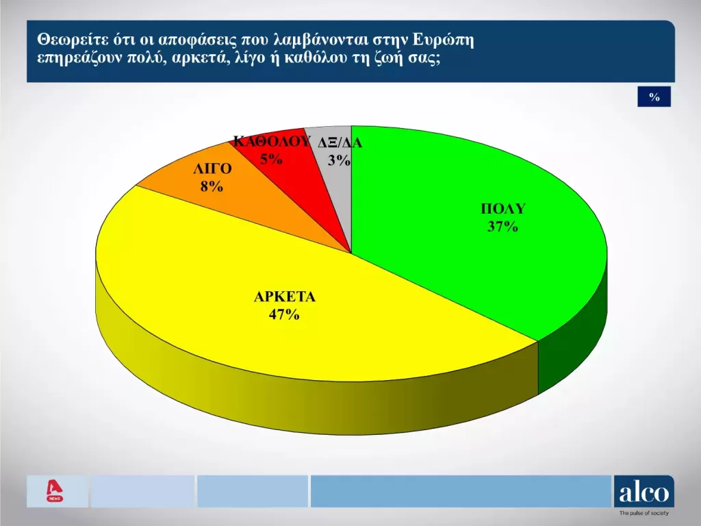 Από εκεί και πέρα το 47% των ερωτηθέντων υποστηρίζει ότι αποφάσεις που λαμβάνονται στην Ευρώπη επηρεάζουν αρκετά τη ζωή τους. Το 37% απαντά «πολύ», «λίγο» λέει το 8% και «καθόλου» μόλις το 5%.