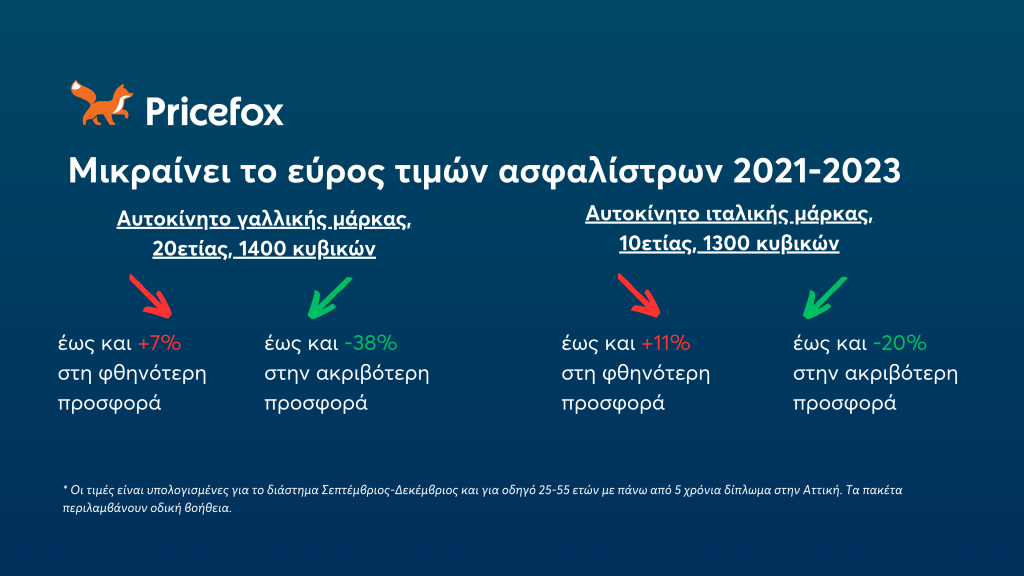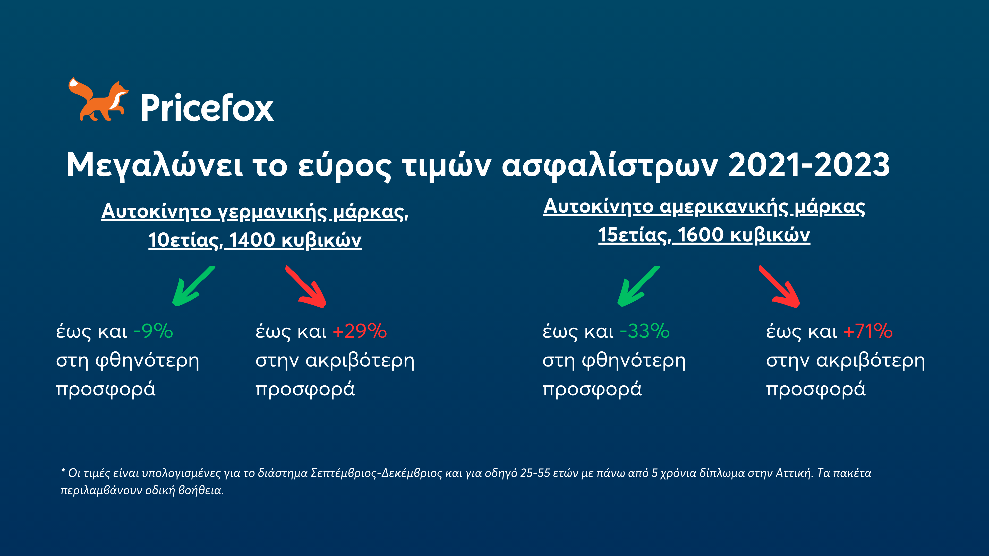 Το Pricefox, η πλατφόρμα σύγκρισης ασφαλειών αυτοκινήτου, ανέλυσε τις τιμές στα ασφάλιστρα αυτοκινήτου στην Αττική για το διάστημα 2021 με 2023 (Σεπτέμβριο με Δεκέμβριο του κάθε έτους) και ενημερώνει τους ιδιοκτήτες αυτοκινήτου σχετικά με τις αλλαγές, συμβουλεύοντάς τους για τα επόμενα βήματα.