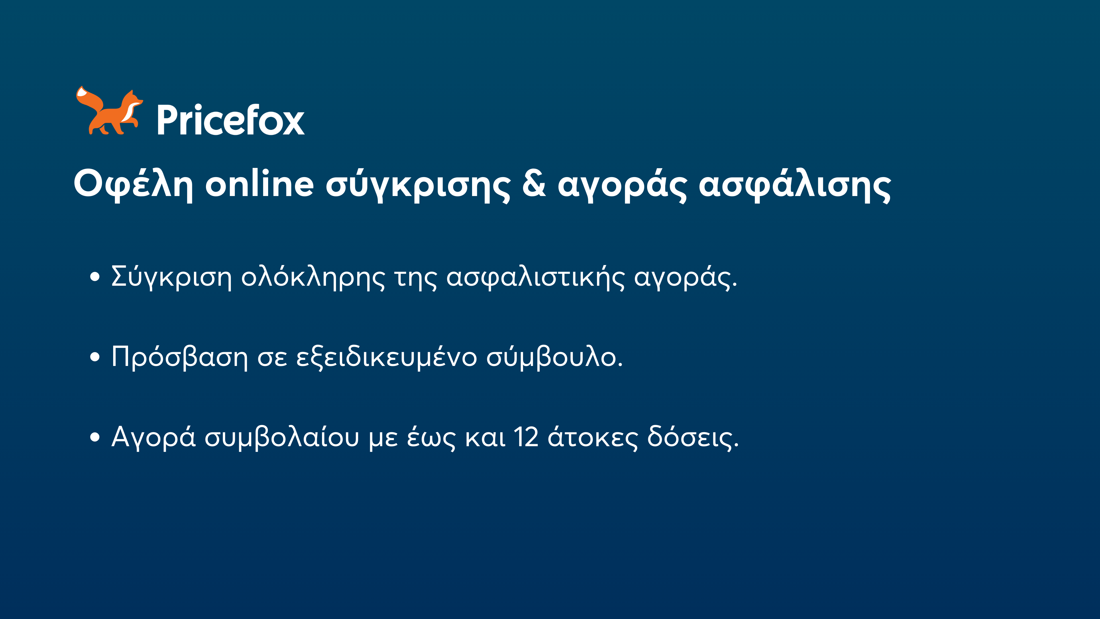Το Pricefox.gr είναι η μεγαλύτερη πλατφόρμα σύγκρισης ασφαλειών αυτοκινήτου και κάθε άλλου οχήματος. Σύγκρινε ετήσια συμβόλαια, εξάμηνα ή άλλα και αγόρασε το πακέτο που ταιριάζει στις ανάγκες σου με έως και 40% χαμηλότερη τιμή.