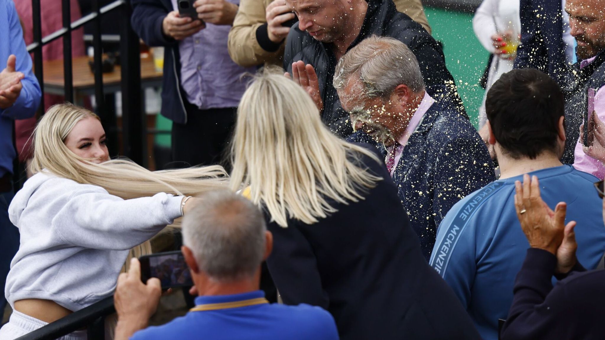 Μια γυναίκα περιέλουσε με αναψυκτικό τον Νάιτζελ Φάρατζ, τον νέο ηγέτη του ακροδεξιού Μεταρρυθμιστικού Κόμματος της Βρετανίας –και αγκάθι στο πλευρό των Συντηρητικών– κατά την πρώτη ημέρα της προεκλογικής εκστρατείας του ενόψει των βουλευτικών εκλογών της 4ης Ιουλίου.