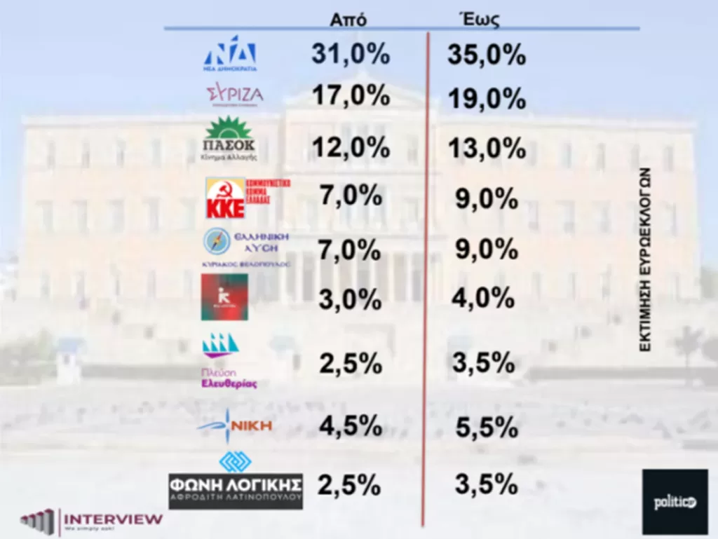 Προβάδισμα 12,9 μονάδων έναντι του ΣΥΡΙΖΑ καταγράφει η Νέα Δημοκρατία στην πρόθεση ψήφου της δημοσκόπησης της POLITIC που διενεργήθηκε από την Interview μόλις πέντε μέρες πριν τις ευρωεκλογές της 9ης Ιουνίου.