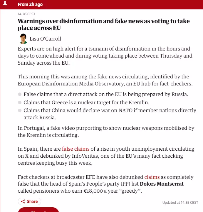 Σύμφωνα με ρεπορτάζ του Guardian -μία ημέρα μετά την έναρξη των Ευρωεκλογών- σήμερα το πρωί (05.06.2024) αυτές οι «ειδήσεις» ήταν μεταξύ των fake news που κυκλοφορούν, οι οποίες εντοπίστηκαν από το Ευρωπαϊκό Παρατηρητήριο Παραπληροφόρησης των Μέσων Μαζικής Ενημέρωσης.