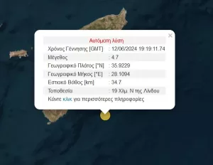 Σύμφωνα με την αυτόματη λύση του Γεωδυναμικού Ινστιτούτου, ο σεισμός που έγινε στη Ρόδο, είχε μέγεθος 4,7 ρίχτερ και επίκεντρο 19 χιλιόμετρα νότια της Λίνδου.