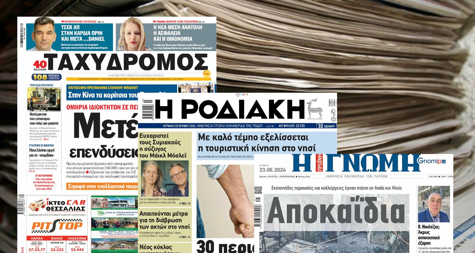 Κοινοποίηση Facebook Twitter LinkedIn Pinterest Email Copy Link Διαβάστε τα πρωτοσέλιδα των σημερινών τοπικών εφημερίδων πηγή frontpages.gr Πρωτοσέλιδα τοπικές εφημερίδες