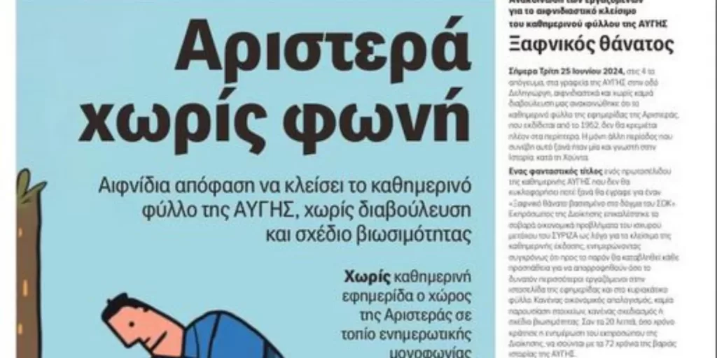 Σε σκίτσο που εμπεριέχεται στο τελευταίο πρωτοσέλιδο της εφημερίδας «Αυγή», φαίνεται ένας άνθρωπος να κόβει το κλαδί στο οποίο στέκεται και από πάνω γράφει «Αριστερά χωρίς φωνή», ενώ στα δεξιά υπάρχει η ανακοίνωση των εργαζομένων του ιστορικού εντύπου.
