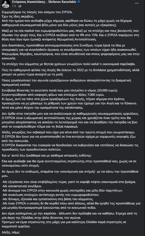Με ανάρτησή του, από τις ΗΠΑ όπου βρίσκεται ο πρόεδρος του ΣΥΡΙΖΑ, ξεσπά κατά του Αλέξη Τσίπρα. Κατηγορεί τον προκάτοχό του εμμέσως για υπονόμευση και του ρίχνει το γάντι: «Έλα και ανάλαβε και θα είμαι συντεταγμένος στρατιώτης στην προσπάθειά σου, χωρίς να σε υπονομεύσω ούτε στιγμή. Αν όμως δεν το επιθυμείς, στήριξε την προσπάθειά μου, χωρίς παιχνίδια» λέει στον Αλέξη Τσίπρα ο Στέφανος Κασσελάκης και του πετά τη φράση «Αλέξη, πάμε;» παραπέμποντας ευθέως στο «Χάρη, πάμε;», που απηύθυνε ο Μανώλης Χριστοδουλάκης στον Χάρη Δούκα για την ηγεσία του ΠΑΣΟΚ.