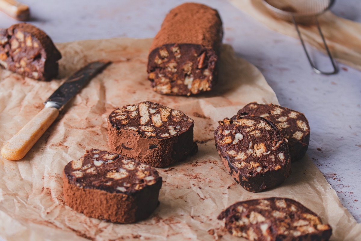 Στρώνουμε λαδόκολλα ή μεμβράνη στον πάγκο μας και ρίχνουμε το μείγμα μας. Διπλώνουμε καλά την μεμβράνη μας ή τη λαδόκολλα σαν να κάνουμε ρολό και τοποθετούμε στην κατάψυξη για 1 με 2 ώρες ή στο ψυγείο για 2 με 3 ώρες.