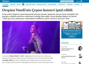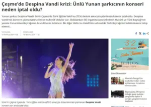 Η ακύρωση συναυλίας της Δέσποινας Βανδή στη Σμύρνη απασχόλησε τα ΜΜΕ της Τουρκίας, καθώς η Ελληνίδα τραγουδίστρια αρνήθηκε να εμφανιστεί στη σκηνή δίπλα σε πόστερ του Κεμάλ Ατατούρκ.