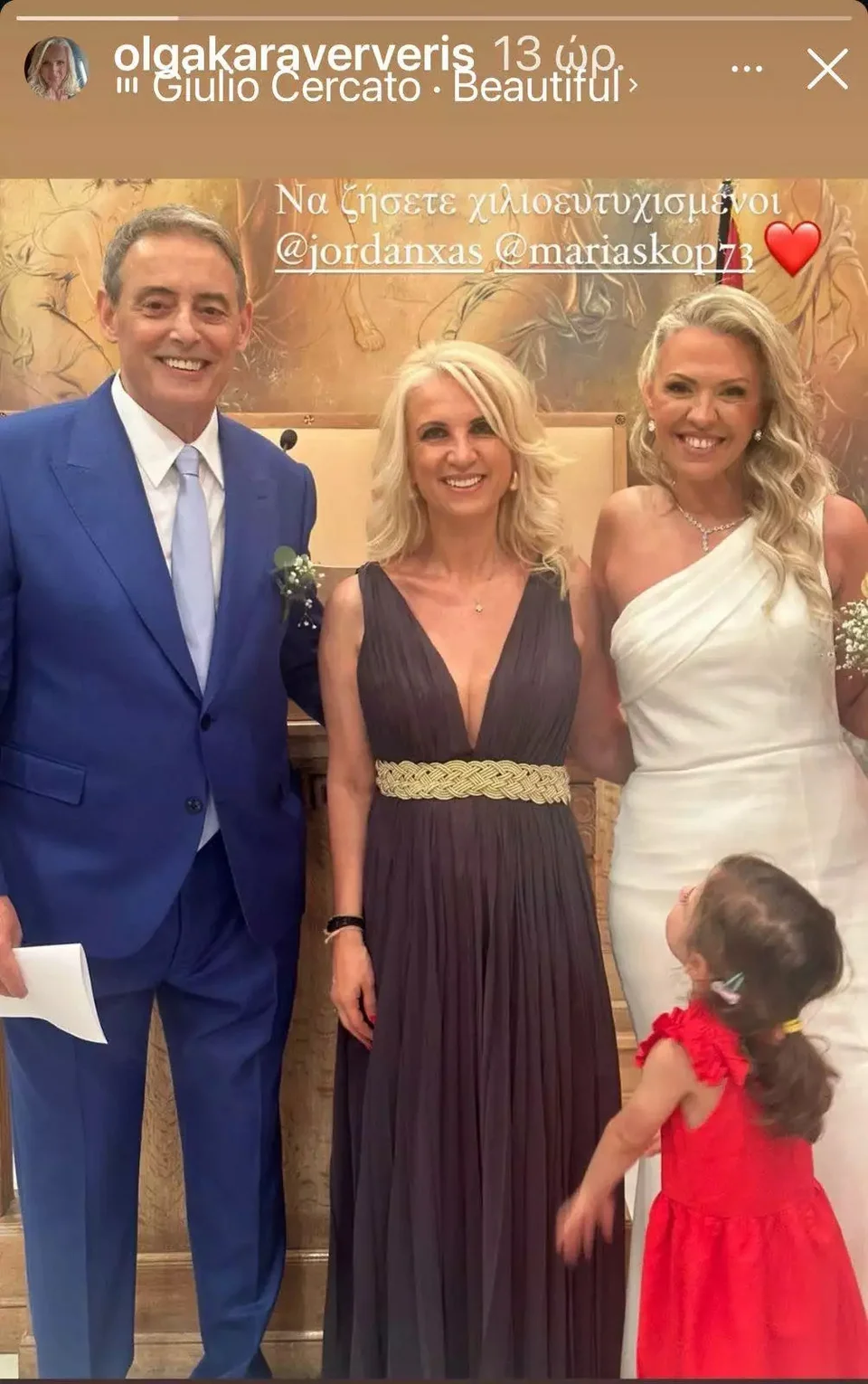Στη φωτογραφία που ανάρτησε η σχεδιάστρια στο Instagram, ο Ιορδάνης Χασαπόπουλος ποζάρει χαμογελαστός φορώντας ένα μπλε σκούρο κοστούμι, ενώ η Μαρία Σκοπελίτου – η οποία εργάζεται ως αισθητικός – επέλεξε ένα εντυπωσιακό λευκό νυφικό σε στενή γραμμή.