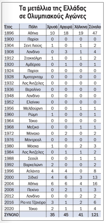 Η Ελλάδα στο παρελθόν έχει καταφέρει να κατακτήσει συνολικά 121 μετάλλια σε Ολυμπιακούς Αγώνες. Από αυτά, τα 35 ήταν χρυσά, τα 45 ασημένια και τα 41 χάλκινα. Ευχή όλων είναι αυτή η συγκομιδή να αυξηθεί στο Παρίσι, με όσο το δυνατόν περισσότερα μετάλλια από τις αθλήτριες και τους αθλητές της χώρας.