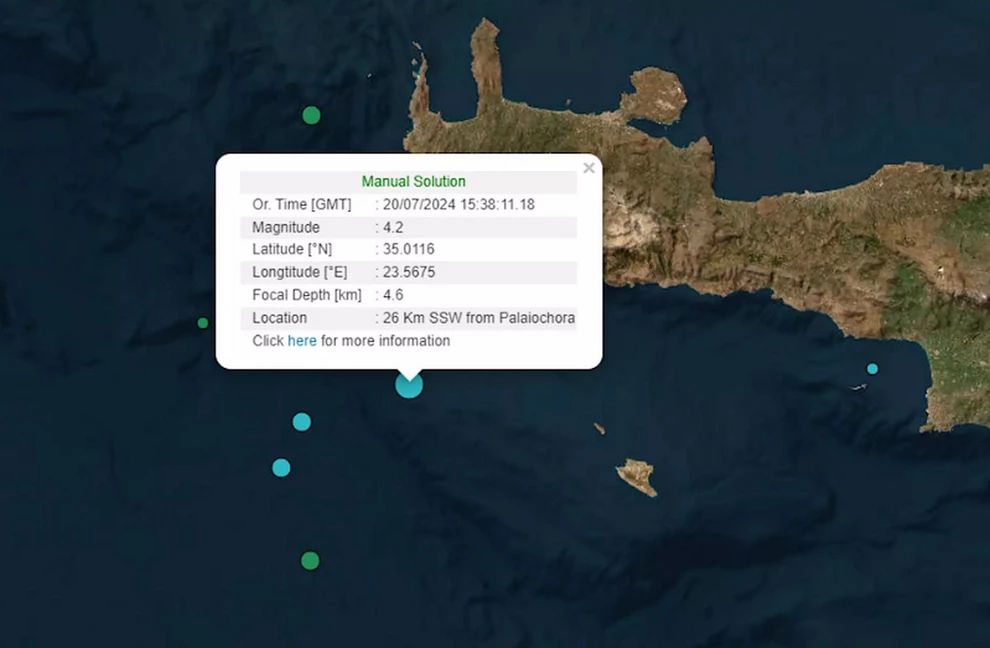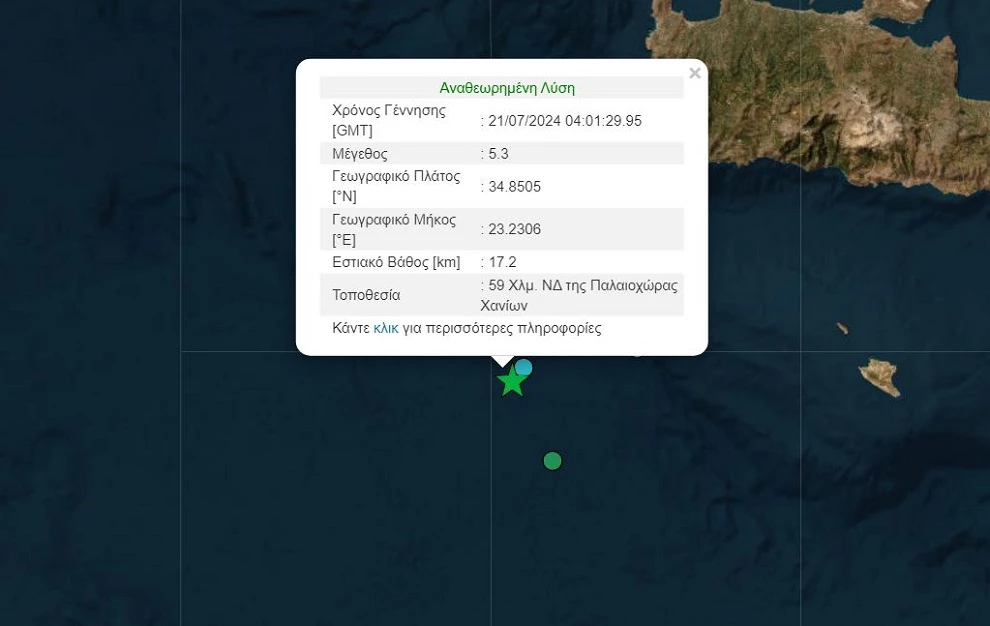 Σεισμός 5,3 Ρίχτερ σημειώθηκε στις 07:01, το πρωί της Κυριακής (21/07) στο θαλάσσιο χώρο, 59 χιλιόμετρα νοτιοδυτικά της Παλαιόχωρας Χανίων.