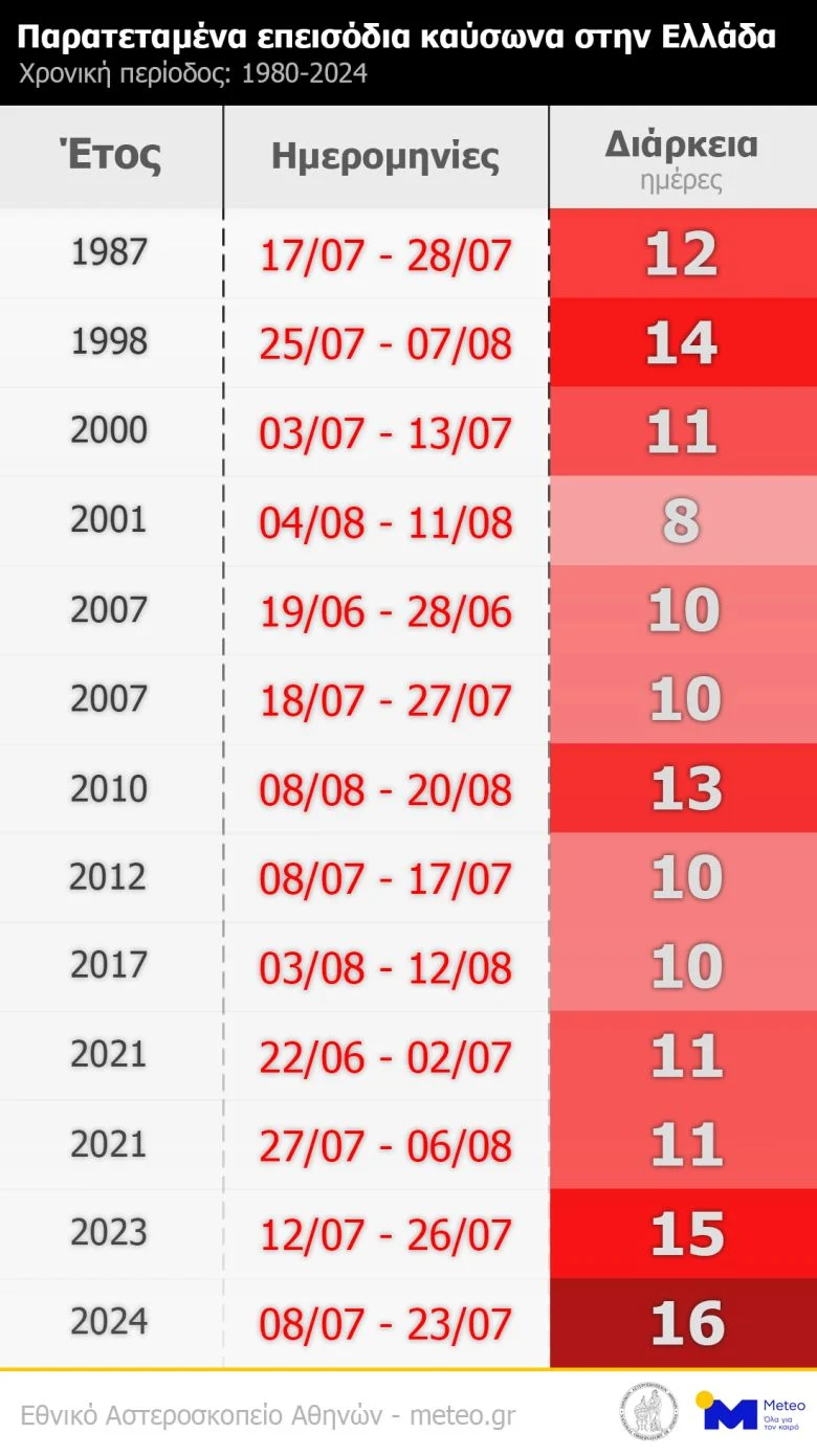 Πρόκειται για τον καύσωνα του Ιουλίου 2023, που είχε διάρκεια 15 ημερών, και τον καύσωνα του Ιουλίου 2024, που ξεπέρασε αυτόν του 2023, με συνολική διάρκεια 16 ημερών.