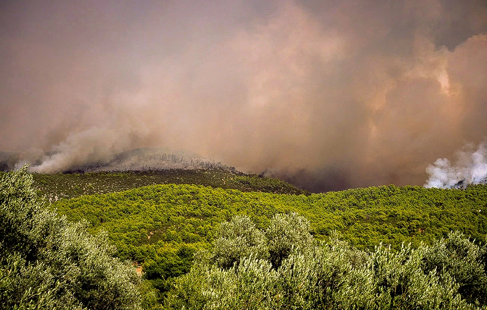 Αποπνικτική είναι η κατάσταση και στην ευρύτερη περιοχή, καθώς οι καπνοί έχουν σκεπάσει τα πάντα, φτάνοντας μέχρι την Αττική.