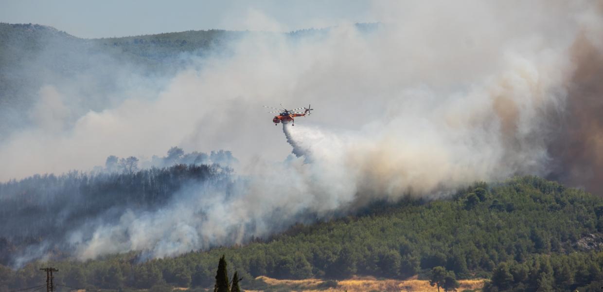 Η μεγαλύτερη μάχη που δίνουν οι πυροσβέστες είναι μέσα σε μια πευκόφυτη περιοχή, την ίδια στιγμή που οι πυκνοί μαύροι καπνοί έχουν κυριολεκτικά δημιουργήσει αποπνικτική ατμόσφαιρα στην ευρύτερη περιοχή, ενώ φτάνουν ακόμη και μέχρι την Αττική.