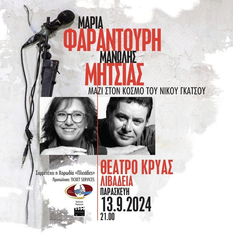 Στις 13 Σεπτεμβρίου η Μαρία Φαραντούρη και ο Μανώλης Μητσιάς δίνουν ραντεβού στο θέατρο της Κρύας για να ταξιδέψουν μουσικά τους επισκέπτες στον κόσμο του μεγάλου ποιητή και στιχουργού Νίκου Γκάτσου. «Χάρτινο το φεγγαράκι» θα τραγουδήσει η Μ. Φαραντούρη κάτω από τα αστέρια στο ανοικτό πέτρινο θέατρο ενώ ο Μ. Μητσιάς θα τραγουδά «Αν θυμηθεί το όνειρο μου, σε περιμένω να ‘ρθεις»
