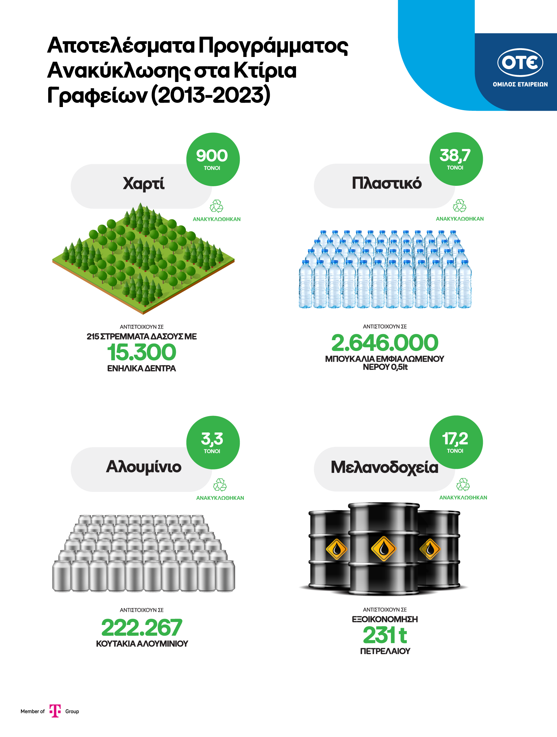 Δέκα χρόνια συμπληρώθηκαν από την έναρξη του Προγράμματος Ανακύκλωσης στα κτίρια του Ομίλου ΟΤΕ, χάρη στο οποίο έχουν ανακυκλωθεί πάνω από 1.000 τόνοι υλικών. Πρόκειται για το πρώτο πρόγραμμα ανακύκλωσης σε χώρο γραφείων στην Ελλάδα που εφάρμοσε την αρχή του διαχωρισμού των υλικών στην πηγή, με τη συλλογή τους σε διαφορετικούς κάδους (διακριτοί κάδοι για χαρτί, συσκευασίες ανά υλικό – πλαστικό, αλουμίνιο, γυαλί, λοιπές συσκευασίες, μελάνια, τηλέφωνα, μικρές ηλεκτρικές και ηλεκτρονικές συσκευές και μπαταρίες). Το πρόγραμμα υλοποιείται από το 2013 σε 24 κτίρια γραφείων του Ομίλου σε όλη τη χώρα, που στεγάζουν 9.000 εργαζόμενους.