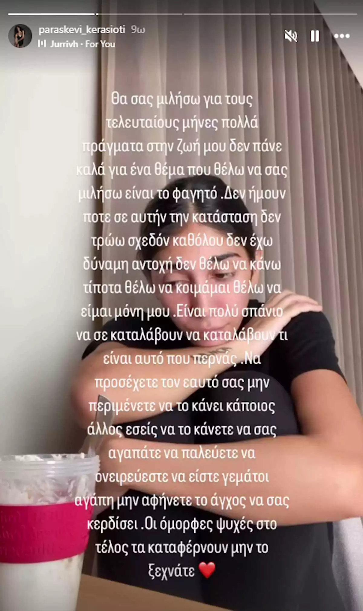 Σε μια «αποκαλυπτική» ανάρτηση στον προσωπικό της λογαριασμό στο Instagram η Παρασκευή Καρασιώτη η οποία μεταξύ άλλων έγραψε «Δεν τρώω σχεδόν καθόλου, δεν έχω δύναμη, αντοχή, δεν θέλω να κάνω τίποτα»,