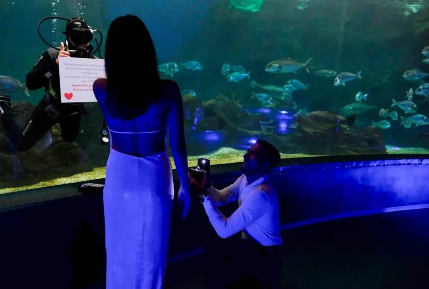 Μια ξεχωριστή πρόταση γάμου κάτω από το νερό έκανε ένας νεαρός στην κοπέλα του στην Κρήτη, ο οποίος με τη βοήθεια ενός δύτη στο ενυδρείο του Ηρακλείου έκανε το μεγάλο ερώτημα στη σύντροφο του.
