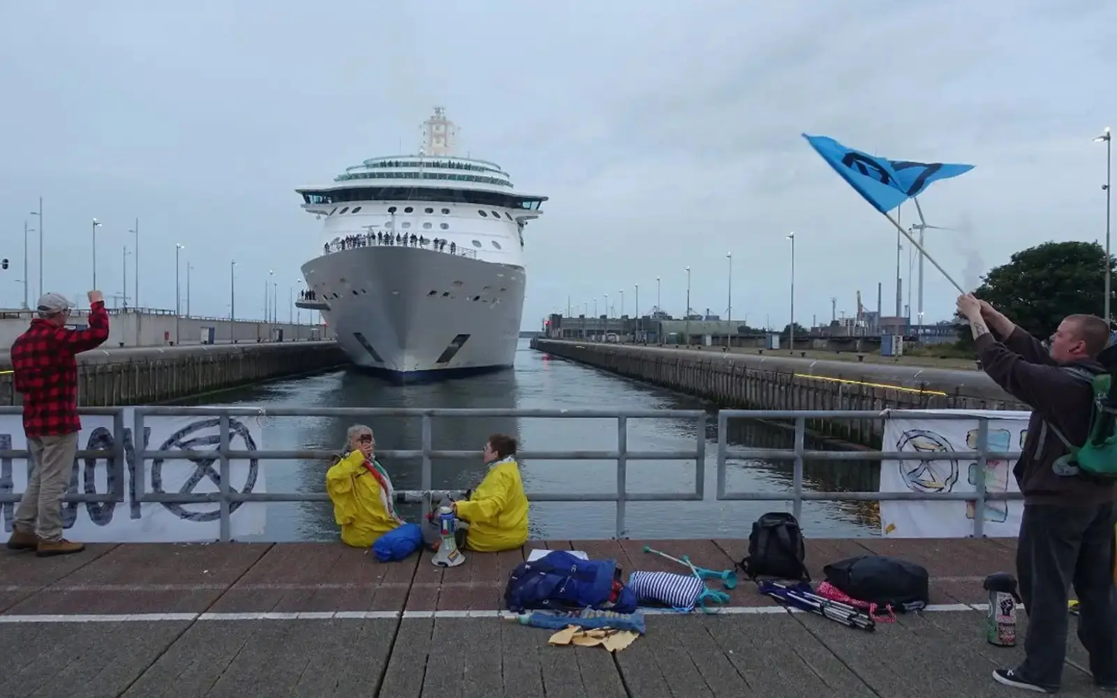 «Το πετρέλαιο σκοτώνει, σταματήστε τα κρουαζιερόπλοια» είχαν γράψει οι ακτιβιστές στο πανό που κρέμασαν στον υδατοφράκτη, στις πύλες του οποίου δέθηκαν το πρωί, σύμφωνα με τα πλάνα που μεταδίδονταν απευθείας στο διαδίκτυο.