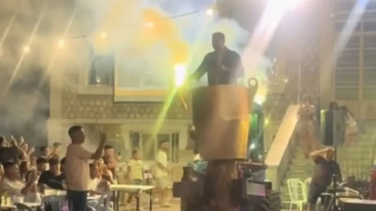 Το μεγάλο όνομα της βραδιάς ήταν ο Γιάννης Νταβέλης, ο οποίος επέλεξε να κάνει μια πραγματικά εντυπωσιακή είσοδο. Ο τραγουδιστής έκανε την είσοδό του στο πανηγύρι μέσα σε μια χρυσή κούπα ενός ανυψωτικού οχήματος, ενώ οι διοργανωτές είχαν ανάψει πράσινα καπνογόνα και φωτορυθμικά.