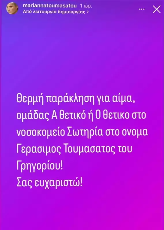 «Θερμή παράκληση για αίμα ομάδας Α Θετικό ή 0 θετικό στο νοσοκομείο Σωτηρία στο όνομα Γεράσιμος Τουμασάτος του Γρηγορίου. Σας ευχαριστώ!» έγραψε η Μαριάννα Τουμασάτου.