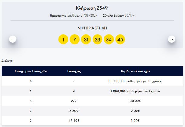 Στην κλήρωση ΛΟΤΤΟ αριθμός 2549, σήμερα Σάββατο 31/08/2024, τυχεροί αριθμοί είναι 1, 34, 33, 7, 31, 45.
