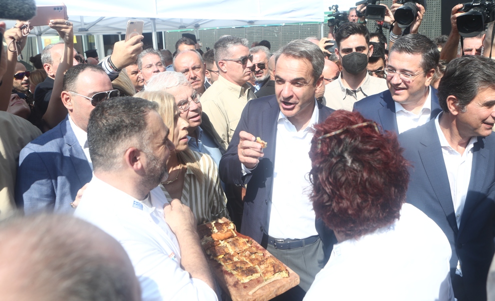 Αμέσως μετά τον αγιασμό και λίγο πριν μπει μέσα για την καθιερωμένη συνάντηση με τη διοίκηση της ΔΕΘ Helexpo ο Κυριάκος Μητσοτάκης έκανε μια στάση μπροστά στα μέλη της Εθνικής ομάδας αρτοποιίας που παρουσίασαν στον πρωθυπουργό στοιχεία της Μακεδονικής κουζίνας .