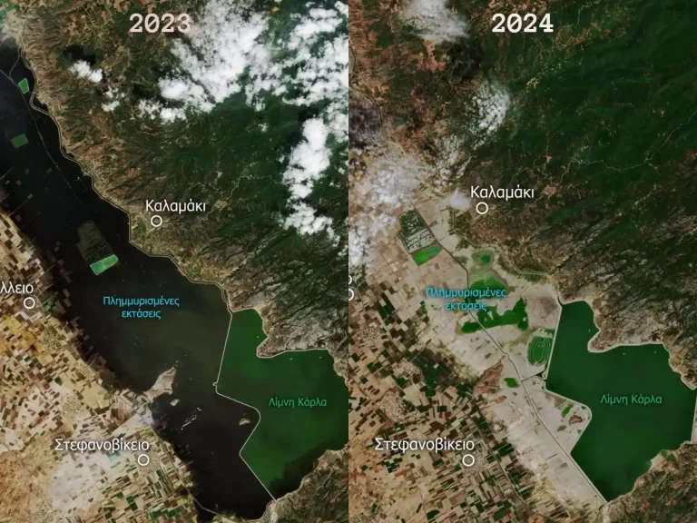 Δορυφορικές εικόνες που επεξεργάστηκε η επιστημονική ομάδα του Climatebook δείχνουν σε υψηλή ανάλυση την κατάσταση στη λίμνη Κάρλα πέρυσι λίγες μέρες μετά την έλευση της κακοκαιρίας Daniel (στις 20 Σεπτεμβρίου 2023), και φέτος ένα χρόνο μετά (στις 4 Σεπτεμβρίου 2024).