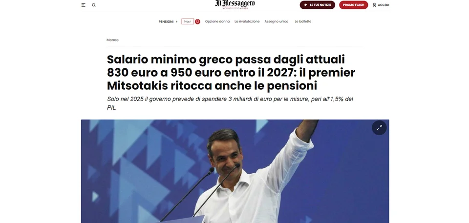 «Ο κατώτατος μισθός θα αυξηθεί, από τα 830 στα 950 ευρώ, εντός του 2027. Ο πρωθυπουργός Κυριάκος Μητσοτάκης αυξάνει και τις συντάξεις», γράφει η εφημερίδα της Ρώμης.