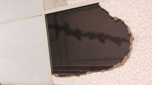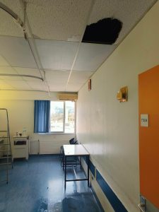 Τμήμα της οροφής σε θάλαμο της Β’ Παθολογικής Κλινικής, που βρίσκεται στον 5ο όροφο κάτω από την ταράτσα, κατέρρευσε όταν εισέρευσαν νερά λόγω της βροχόπτωσης.