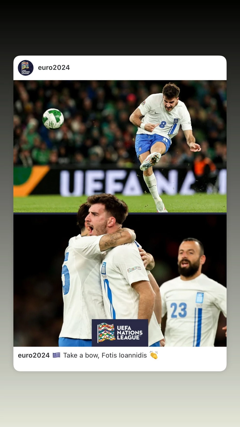 Ο Φώτης Ιωαννίδης στον αγώνα της Εθνικής Ελλάδος με αντίπαλο την Ιρλανδία για το Nations League σημείωσε ένα γκολ σπάνιας ομορφιάς, με τη διοργάνωση να «αποθεώνει» τον έλληνα striker και την Ελένη Βουλγαράκη να αναδημοσιεύει το ποστ.