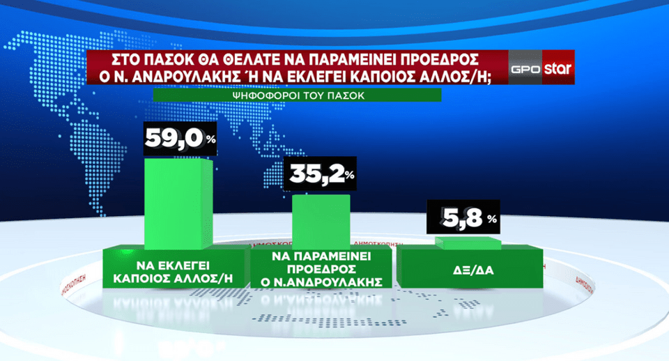 Σχεδόν 6 στους 10 ψηφοφόροι του ΠΑΣΟΚ θέλουν να εκλεγεί άλλος πρόεδρος έναντι ποσοστού 35,2% που θεωρούν ότι πρέπει να επανεκλεγεί ο Νίκος Ανδρουλάκης.