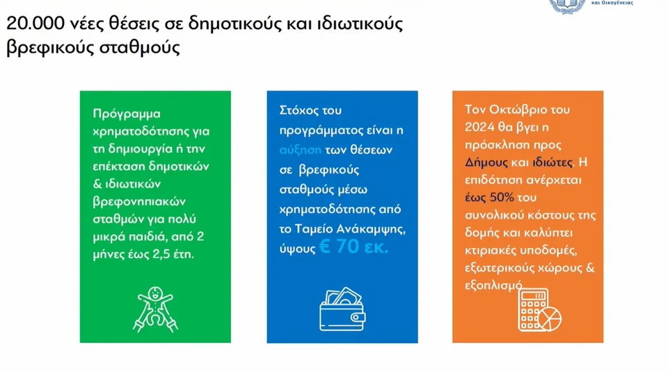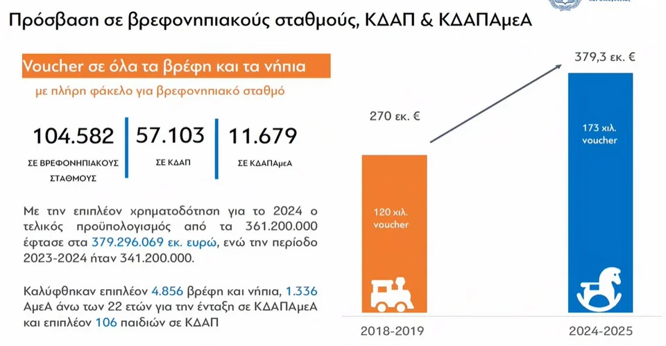 Η κυρία Ζαχαράκη ενημέρωσε ότι το πρόγραμμα των voucher θα είναι «στον αέρα» στο τέλος Οκτωβρίου και αφορά δήμους και ιδιώτες. «Μιλάμε για την αύξηση θέσεων σε υπάρχοντες σταθμούς αλλά και τη δημιουργία νέων σταθμών. Είναι χρηματοδότηση 70 εκατ από το Ταμείο Ανάκαμψης. Μιλάμε για παιδιά από 2 μηνών έως 2,5 ετών. Καλύπτει και έως 50% κτιριακές υποδομές και εξοπλισμό».