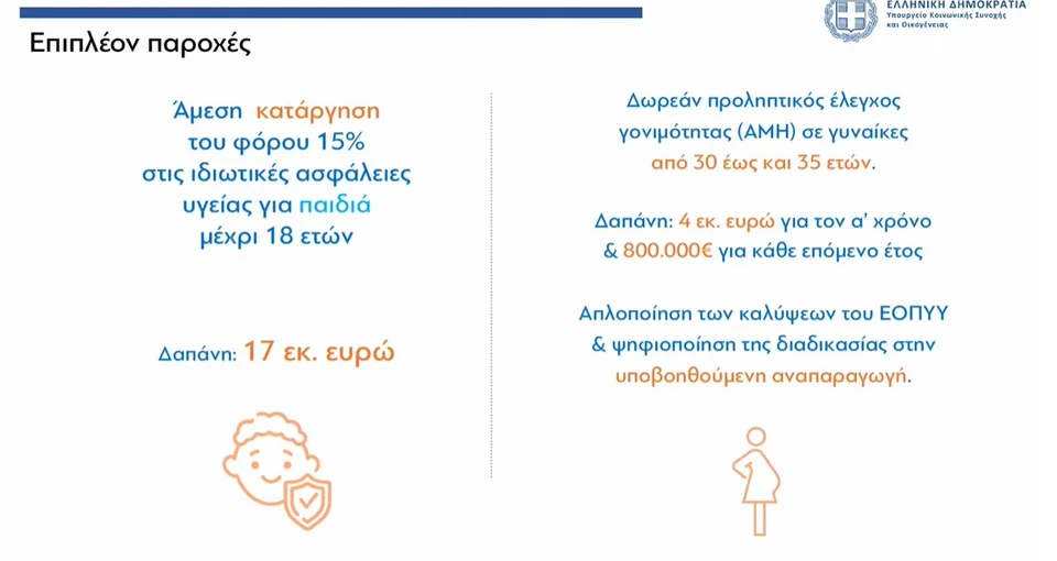 Ένα μεγάλο κομμάτι που αφορά το δημογραφικό αφορά την αναπαραγωγική υγεία και πώς μπορούμε να διευκολύνουμε την πρόσβαση των γυναικών με κάλυψη περισσότερων εξετάσεων στον τομέα αυτόν. Ήδη από τις αιματολογικές εξετάσεις που απαιτούνται προκειμένου μία γυναίκα να μπορέσει να κάποια στιγμή να αποκτήσει παιδί, καλύπτεται κατά 85% από τον ΕΟΠΠΥ.